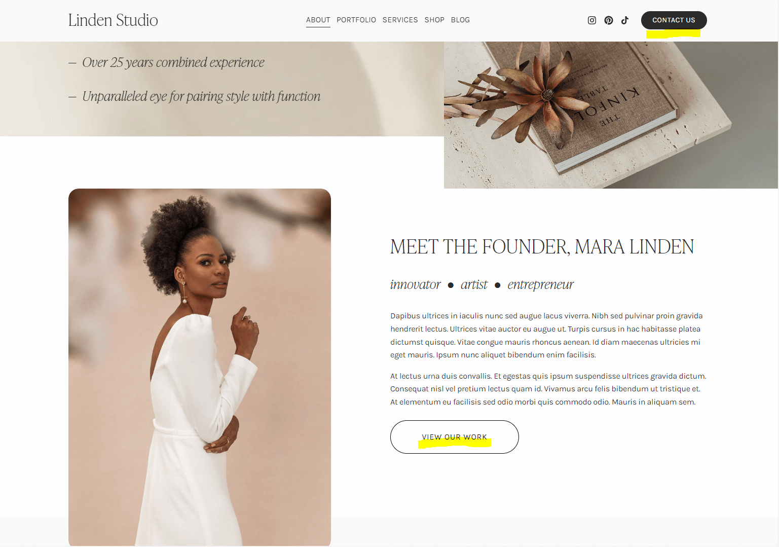 2 calls to action on this section of the About page on Scale Studio’s Linden template.